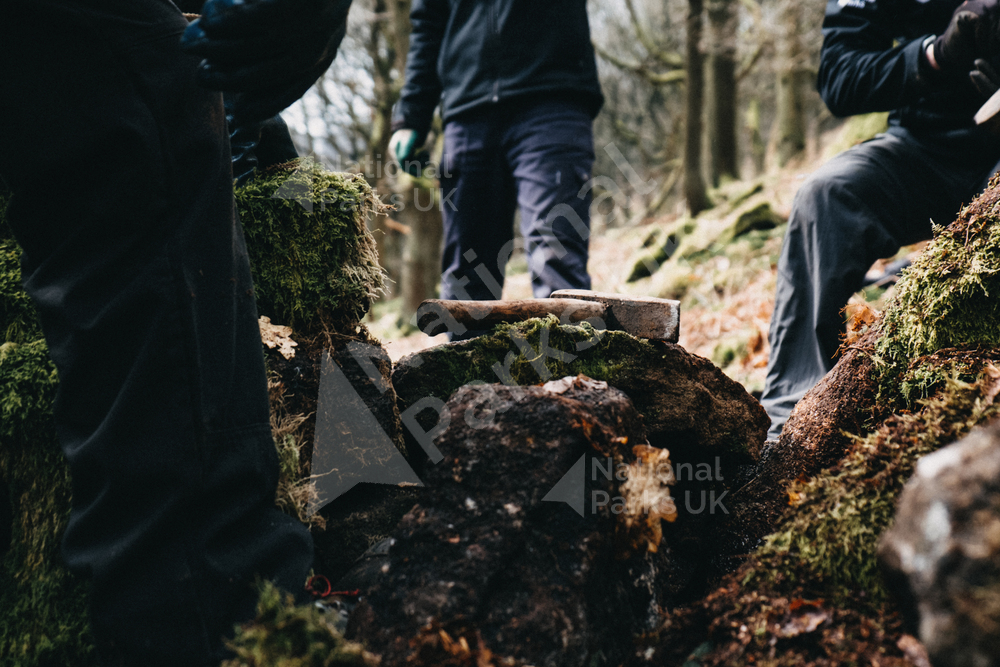 Peak District National Park Rangers, repairing a wall in a woodland