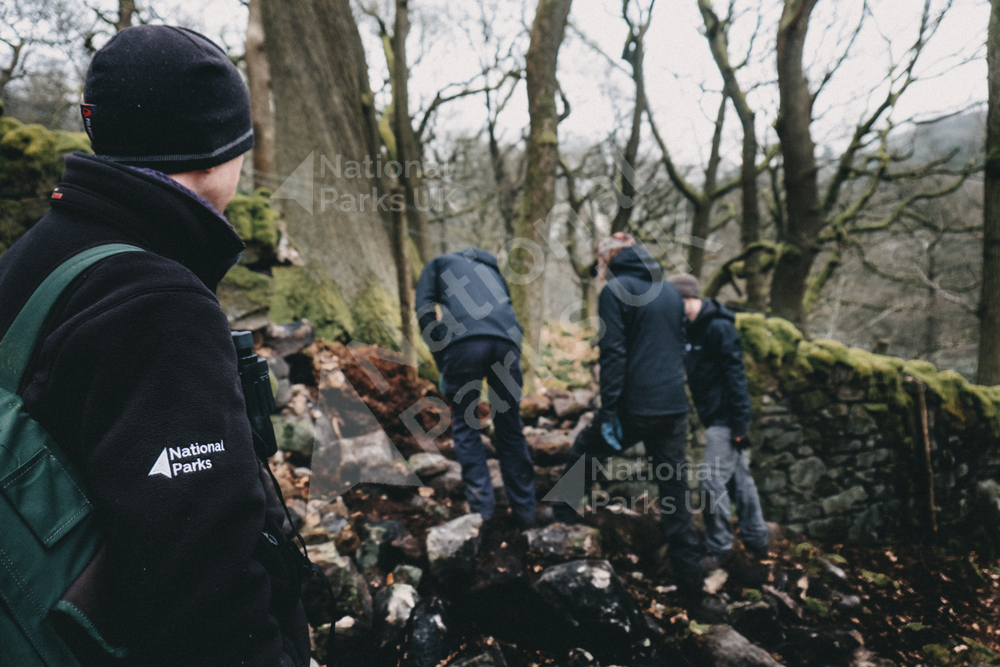 Peak District National Park Rangers, repairing a wall in a woodland