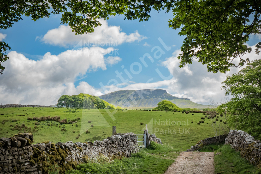 One of the famous Yorkshire Three Peaks. This is a walkers eye view of the peak from the footpath out of Horton-in-Ribblesdale looking out through trees on a fine Summer day.