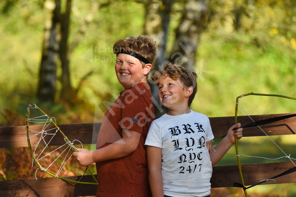 Two boys pose for the camera with wood crafts whilst at a Wild Play day at Holmsley, New Forest in 2018.
