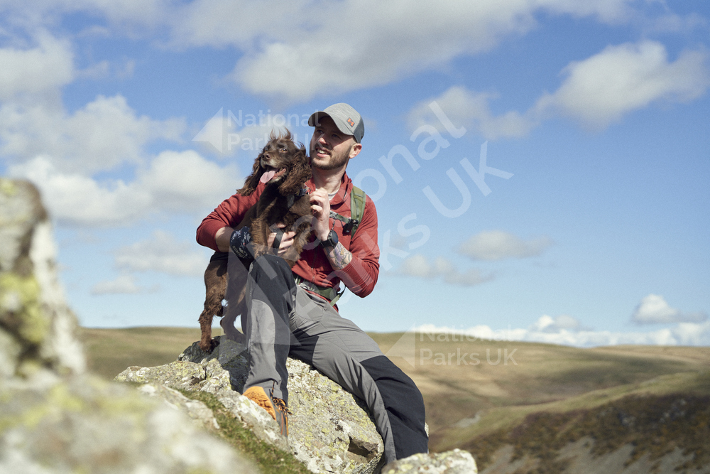 Man and his spaniel enjoying the view of The Cheviot Hills